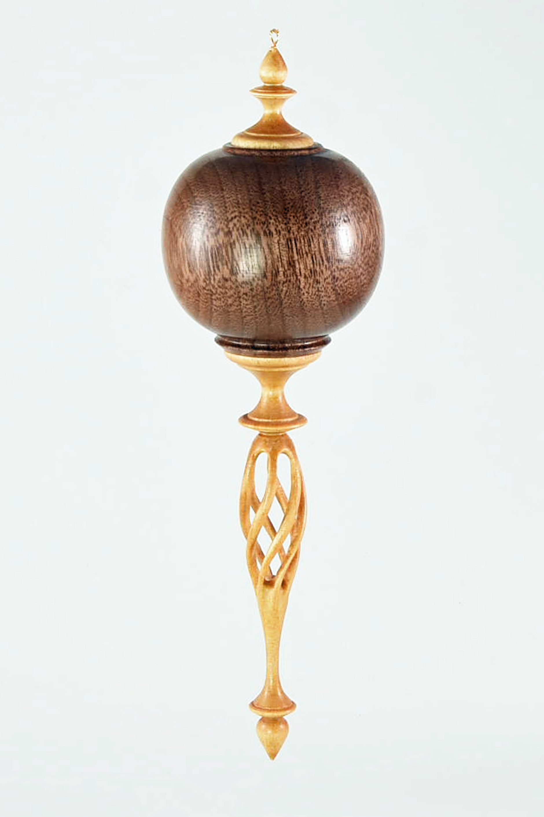 The globe is hollowed and is of walnut. The finial and icicle are of maple. The icicle spiral form was sketched out on the onion and then I used dental style bits with my master carver to ream out the spiral form. Once the onion form has been ‘hollowed’ I then spend quite a bit of time with small strips of sandpaper to complete the process. I try and pay special attention to overall form and to how the separate pieces mate with each other. -Jim Beckwith