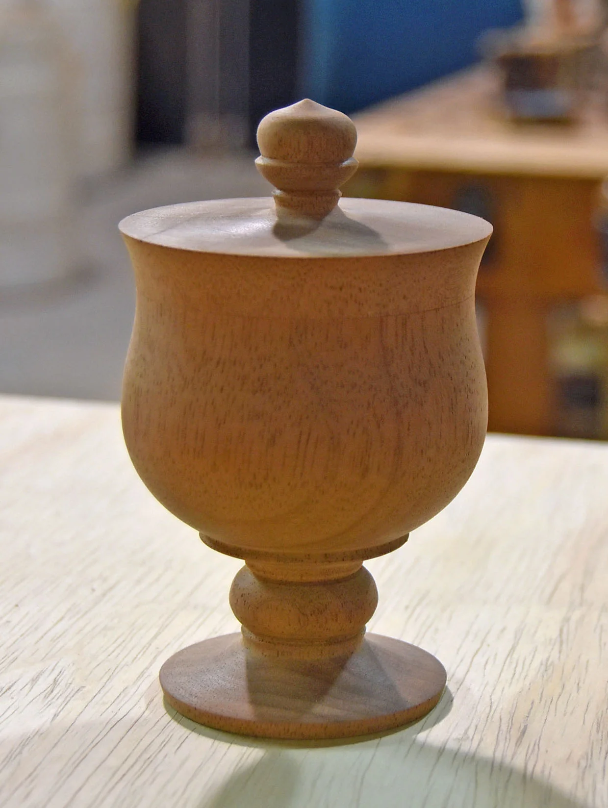 To make one, Michael starts with a cylinder, forms tenons on both ends and marks off the cap, base and widest part of the midsection. Michael then, separates the base from the cap, forms the inside of the cap, forms the matting surface of the body, puts the two back together and begins shaping the finial, cap and body. Yep, he makes it look easy!